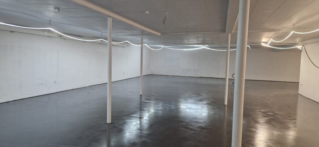 Så er endnu en stor milepæl nået: det nye gulv i butikken er nu lagt, og lokalet begynder virkelig at tage form igen. (Se billede herunder)